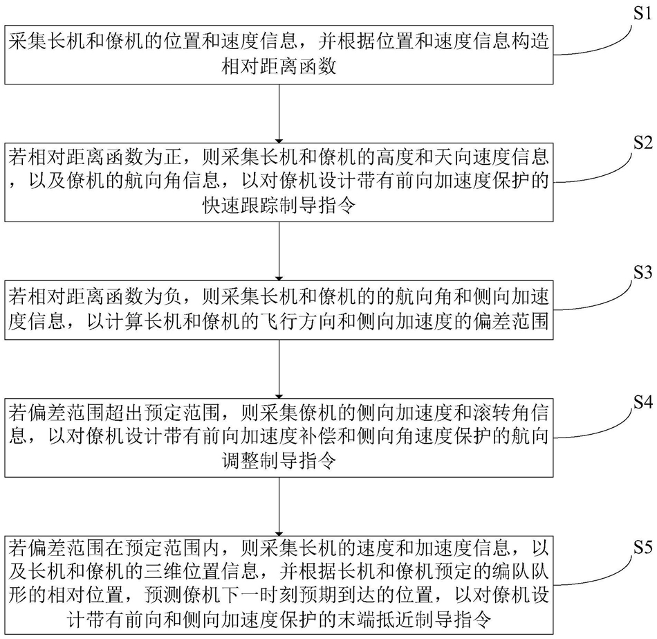 若所述相对距离函数为正,则采集所述长机和所述僚机的高度和天向速度信息,以及所述僚机的航向角信息,以对所述僚机设计带有前向加速度保护的快速跟踪制导指令;