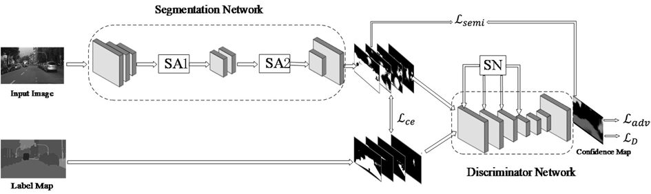 3.根据权利要求1所述的自注意对抗学习的半监督语义分割方法,其特征在于,步骤3)中所述的训练,包括如下步骤:步骤1、将带标记图像经过鉴别器5000次的迭代训练,然后对分割网络和鉴别器进行联合更新;