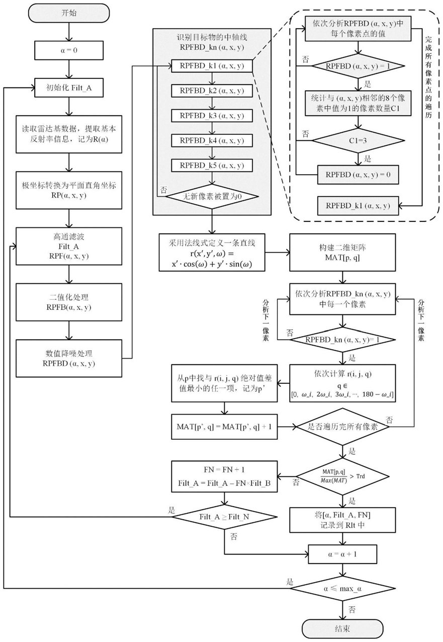 如果步骤8中RPFBD_kn(α,x,y)存在飑线,则将数据组[α,Filt_A,FN]记录到数据集Rlt中,并进入步骤10;如果步骤8中不存在飑线,则先令计数器FN=FN+1,高通滤波阈值Filt_A=Filt_A–FN×Filt_B,其中,Filt_B是一个定值参数,取1至10的正整数;再判断Filt_A和定值参数Filt_N的大小,如果Filt_A≥Filt_N,则返回步骤4;反之,如果Filt_A