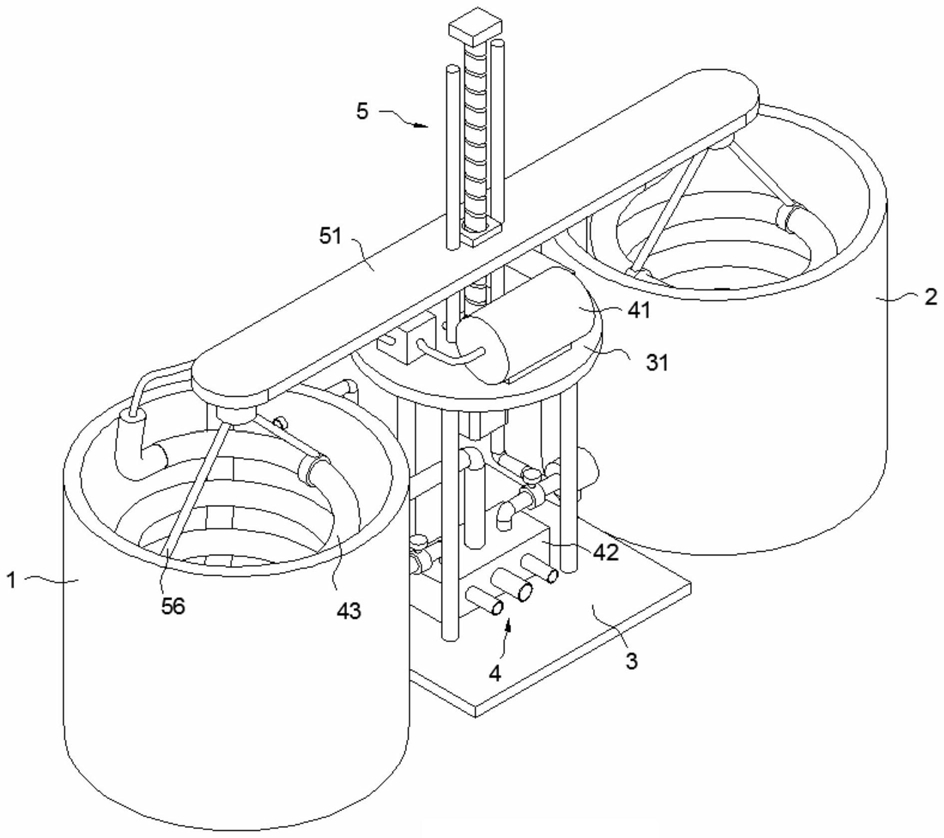 3.根据权利要求1或2所述的一种分段脱水的垃圾渗滤液处理用低温浓缩装置,其特征在于:所述渗透液罐(1)的一侧设置有固定架(3),所述固定架(3)上设置有升降装置(5),所述升降装置(5)包括升降电机(52),所述固定架(3)的顶部通过支柱固定安装有上支架(31),所述升降电机(52)安装在上支架(31)的底部,所述升降电机(52)的输出轴连接有丝杆(521),所述上支架(31)的顶部对应安装有导杆(53),所述丝杆(521)的外部滑动套接有支撑板(51),所述支撑板(51)与丝杆(521)通过滚珠螺母副活动连接,所述换热器(43)的顶部对应连接有钢丝绳(56),所述钢丝绳(56)的顶端与支撑板(51)相连接。