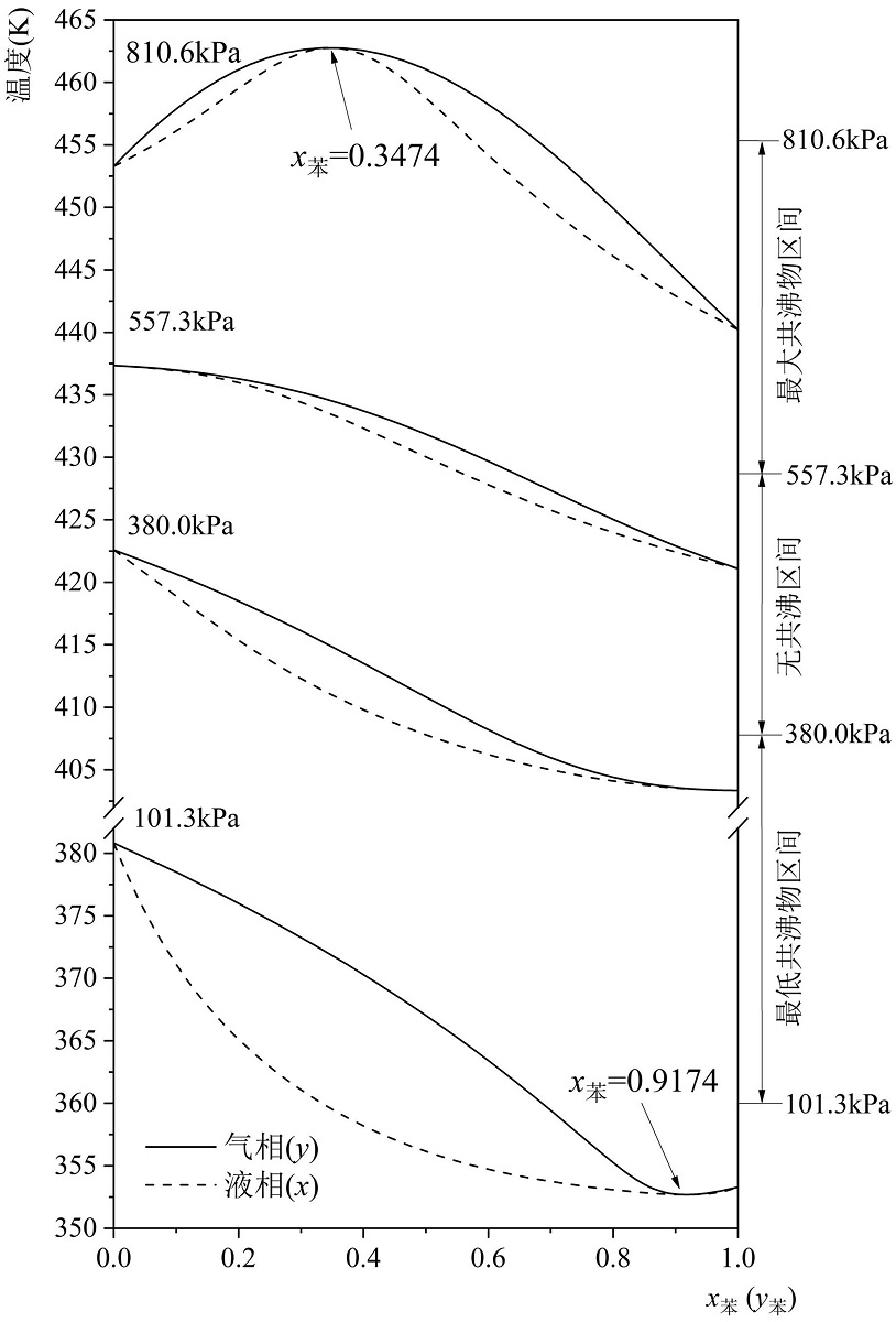 (3)高压精馏塔塔顶高纯度的苯蒸汽进入低压提馏塔塔釜再沸器管程,与异丁醇产品换热,实现完全热集成,苯蒸汽得以冷凝,高纯度的异丁醇得以气化,冷凝后的苯蒸汽经分配器Ⅰ分配后,部分作为塔顶液体回流,其余作为苯产品采出,高压精馏塔液体经过阀门节流降压后,与原料同时进入低压提馏塔塔顶;