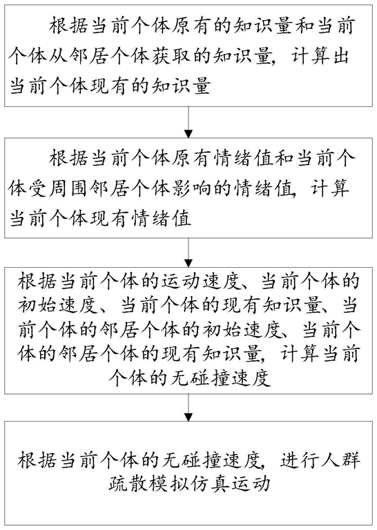 3.如权利要求1所述的方法,其特征是,所述根据当前个体的运动速度、当前个体的初始速度、当前个体的现有知识量、当前个体的邻居个体的初始速度、当前个体的邻居个体的现有知识量,计算当前个体的无碰撞速度步骤之前,所述根据当前个体原有情绪值和当前个体受周围邻居个体影响的情绪值,计算当前个体现有情绪值步骤之后,还包括:根据当前个体现有情绪值,计算当前个体运动速度大小;