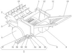 1.一种用于蔬菜温室大棚的土壤虫害防控施药装置,其特征在于:包括放置箱(1)、开垦轮(2)、电机(3)、车轮(4)、两个翻转机构(5)和施药杆(6),所述开垦轮(2)设在放置箱(1)前侧,电机(3)设在放置箱(1)前侧,电机(3)的传动轴与开垦轮(2)相连,电机(3)能带动开垦轮(2)旋转,开垦轮(2)用于农田开垦,车轮(4)对称设在放置箱(1)两侧,施药杆(6)位于放置箱(1)内,放置箱(1)上开设有两个滑道(13),所述施药杆(6)能从放置箱(1)内滑入滑道(13)内,两个滑道(13)与两个翻转机构(5)一一对应,两个翻转机构(5)分别设在放置箱(1)两侧,滑道(13)内设有气缸(7),气缸(7)用于推动施药杆(6)向翻转机构(5)靠近,所述翻转机构(5)能将滑道(13)内的施药杆(6)取出插在农田上。