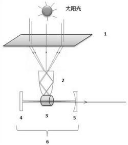 1.一种基于低损耗工作介质的太阳光泵浦固体激光器,包括太阳光汇聚系统和谐振腔(6);其特征在于,所述太阳光汇聚系统包括多级汇聚系统,所述谐振腔(6)包括在谐振腔体中相对布置的全反镜(4)和输出镜(5)、以及设置在全反镜(4)和输出镜(5)之间的侧面泵浦激光工作介质(3),所述激光工作介质(3)放置在所述太阳光汇聚系统中最后一级汇聚出光口的正下方0.1cm-0.5cm处,所述激光工作介质(3)为Cr,Nd:LuGdAG透明陶瓷,其化学式为(Gd1-xLuxNdy)3(Al1-zCrz)5O12,其中0.30≤x≤0.45,0.03≤y≤0.07,0.03≤z≤0.05,且0.5≤y/z≤2。