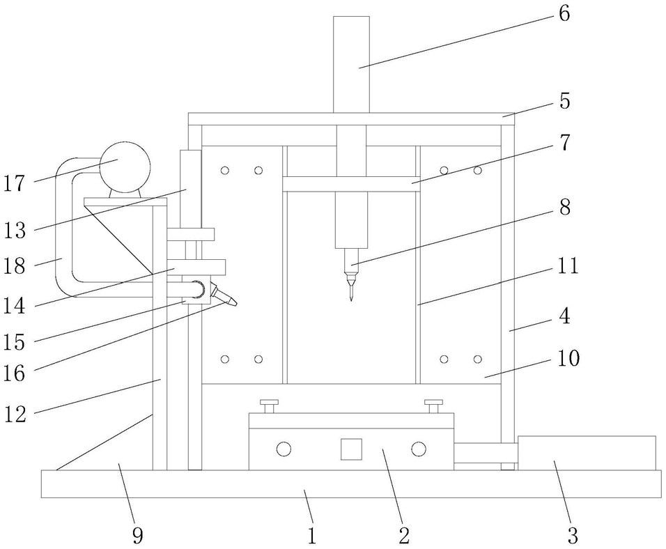 3.根据权利要求1所述的一种小型金属激光焊接装置,其特征在于:所述冷却机构(9)包括支架(12),所述支架(12)固定在底座(1)顶端,所述支架(12)右端安装有调节气缸(13),所述调节气缸(13)的伸缩端安装有滑块(14),所述滑块(14)滑动安装在支架(12)上,所述滑块(14)底端设置有固定块(15),所述固定块(15)右端安装有喷嘴(16),所述喷嘴(16)的输入端连接有软管(18),所述支架(12)上固定安装有气泵(17),所述软管(18)远离喷嘴(16)的一端与气泵(17)的输出端相连接。