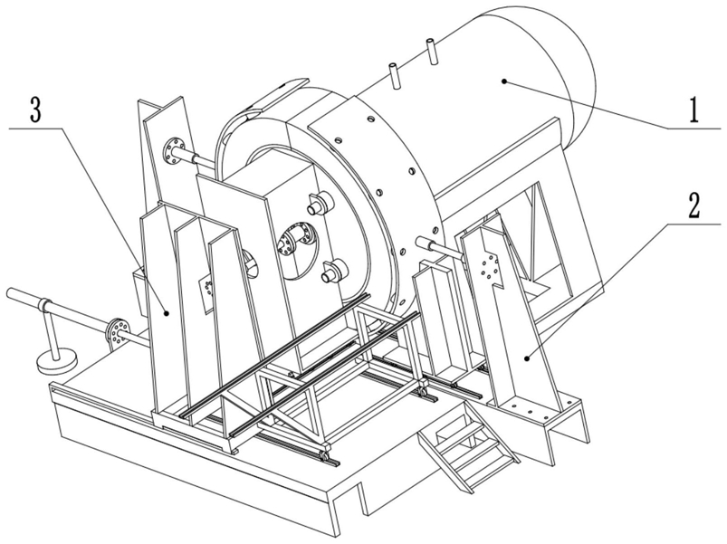 4.根据权利要求1所述的一种全自动开合卧式超临界流体发泡设备,其特征在于:端盖组件(3)包含端盖底座(31)、物料导入架(32)、支撑架底板(33)、固定架A(34)、液压装置A(35)、端盖支撑架(36)、端盖(37)和垫圈(38);