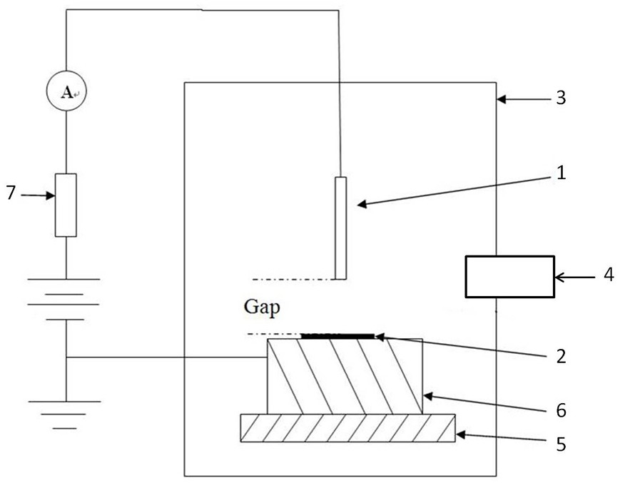1.一种评估半导体屏蔽材料发射性能的测试装置,其特征在于,包括真空控制系统、性能测试系统,其中,性能测试系统包括测试室、测试样品、载物台、阳极、电流表、保护电阻、高压直流电源,所述测试样品固定在载物台上作为阴极,阳极接高压直流电源的正极端,测试样品接高压直流电源的阴极端,高压直流电源的阴极端接地,保护电阻和电流表串联在电路中,所述阳极、阴极均位于测试室中,所述真空控制系统控制测试室为真空状态。