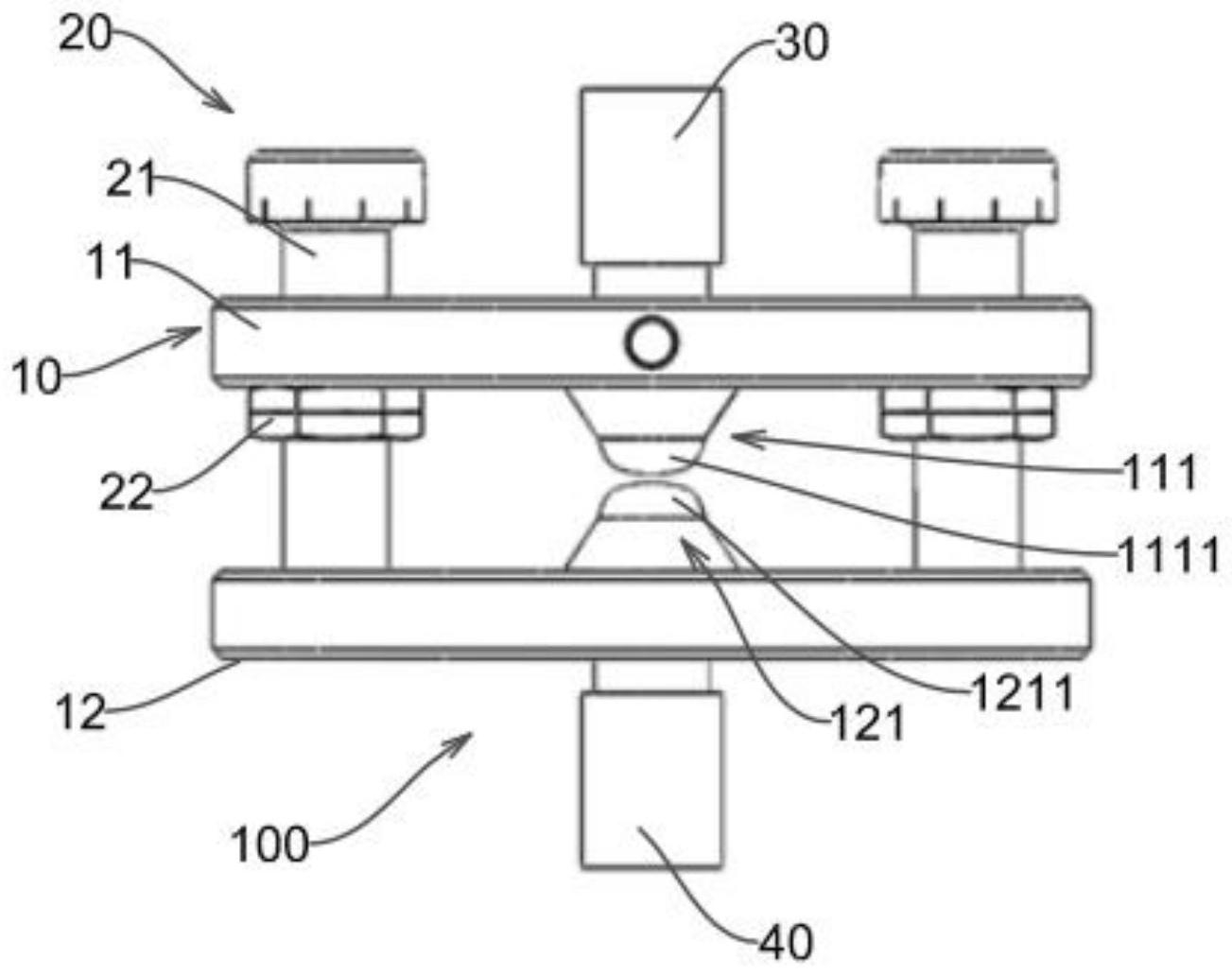 1.一种试样压制机构,其特征在于,包括压盘组件(10)及调节组件(20),所述压盘组件(10)包括第一压盘(11)以及面向所述第一压盘(11)的第二压盘(12),所述调节组件(20)连接于所述第一压盘(11)及第二压盘(12)上,并能够调节所述第一压盘(11)与第二压盘(12)之间的压制距离。2.如权利要求1所述的试样压制机构,其特征在于,所述第一压盘(11)形成有第一挤压件(111),所述第一挤压件(111)朝向所述第二压盘(12)设置并形成有第一挤压部(1111),所述第一挤压部(1111)具有弧形表面;及/或,所述第二压盘(12)形成有第二挤压件(121),所述第二挤压件(121)朝向所述第一压盘(11)设置并形成有第二挤压部(1211),所述第二挤压部(1211)具有弧形表面。3.如权利要求1所述的试样压制机构,其特征在于,所述试样压制机构(100)设置有第一连接柱(30),所述第一连接柱(30)连接于所述第一压盘(11)背向所述第二压盘(12)的一侧。4.如权利要求1所述的试样压制机构,其特征在于,所述第一压盘(11)面向所述第二压盘(12)的一侧开设有至少一个放置孔(13)。5.如权利要求4所述的试样压制机构,其特征在于,所述第一压盘(11)的侧壁开设有至少一个固定孔(14),所述固定孔(14)与所述放置孔(13)相连通。6.如权利要求1所述的试样压制机构,其特征在于,所述调节组件(20)包括调节杆(21)及调节螺母(22),所述调节杆(21)的底部穿过所述第一压盘(11)并与所述第二压盘(12)相抵接;所述调节螺母(22)螺接于所述调节杆(21)并与所述第一压盘(11)相抵接。7.如权利要求1所述的试样压制机构,其特征在于,所述试样压制机构(100)设置有第二连接柱(40),所述第二连接柱(40)连接于所述第二压盘(12)背向所述第一压盘(11)的一侧。8.一种用于测试沥青-集料界面粘结性能的装置,其特征在于,所述用于测试沥青-集料界面粘结性能的装置(200)设置有权利要求1-7任一项所述的试样压制机构(100)。9.如权利要求8所述的用于测试沥青-集料界面粘结性能的装置,其特征在于,所述用于测试沥青-集5料界面粘结性能的装置(200)包括活动轴(201)、固定平台(202)及测试壳体(203),所述活动轴(201)连接于第一压盘(11);所述固定平台连接于第二压盘(12);所述活动轴(201)、固定平台(202)及试样压制机构(100)均设置于所述测试壳体(203)内。10.如权利要求9所述的用于测试沥青-集料界面粘结性能的装置,其特征在于,所述用于测试沥青-集料界面粘结性能的装置(200)包括传感件(204),所述传感件(204)设置于所述第一压盘;及/或,所述用于测试沥青-集料界面粘结性能的装置(200)包括控温模组(205),所述控温模组(205)设置于所述测试壳体(203)。