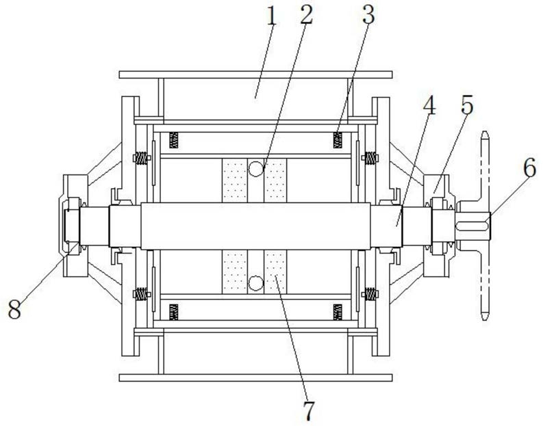 1.一种用于机电设备安装用平衡装置,包括基座(12),其特征在于,所述基座(12)的顶部外壁两侧均通过螺栓固定有电磁调节结构(13),且基座(12)的顶部外壁中部设置有调节空腔,所述调节空腔内壁通过铰链固定有调节筒,且调节筒的两侧外壁均焊接有侧防护架(1),两个所述侧防护架(1)的底端外壁通过螺栓固定在电磁调节结构(13)的顶端外壁上,且调节筒的两端外壁分别焊接有防回轴套(5)和稳定轴套(8),所述防回轴套(5)和稳定轴套(8)的内壁通过轴承连接有同一个主调节轴(4),且主调节轴(4)远离稳定轴套(8)的一端外壁通过螺栓固定有调节手轮(6),所述调节筒的内壁中部设置有环套(7),且环套(7)的内壁开有滑动凹槽,滑动凹槽内壁穿插有螺旋环(2),所述螺旋环(2)的一端连接在主调节轴(4)的外壁上,两侧所述侧防护架(1)的顶部外壁通过螺栓固定有同一个安装座(9)。2.根据权利要求1所述的一种用于机电设备安装用平衡装置,其特征在于,所述调节筒的外壁开有卡槽,且卡槽内壁卡接有外磁筒(11)。3.根据权利要求2所述的一种用于机电设备安装用平衡装置,其特征在于,所述调节筒和环套(7)之间设置有撑杆和磁限位块(3),且调节筒和外磁筒(11)的之间等距离环形分布有电磁铁,撑杆的一端连接在磁限位块(3)的内壁上,撑杆的另一端插接在环套(7)的内壁上。4.根据权利要求1所述的一种用于机电设备安装用平衡装置,其特征在于,所述安装座(9)的四侧内壁均通过螺栓固定有压力传感器(10),且压力传感器(10)的信号端通过信号线连接有PLC控制器。5.根据权利要求1所述的一种用于机电设备安装用平衡装置,其特征在于,所述电磁调节结构(13)包括电磁撑杆和支撑弹簧,且支撑弹簧套接在电磁撑杆的外壁上。6.根据权利要求1所述的一种用于机电设备安装用平衡装置,其特征在于,所述主调节轴(4)靠近调节手轮的外壁套接有止回环,且防回轴套(5)的内壁开有止回槽,止回环和止回槽之间形成卡接配合。7.根据权利要求5所述的一种用于机电设备安装用平衡装置,其特征在于,所述电磁撑杆连接有开关,且开关通过导线和PLC控制器相连接。