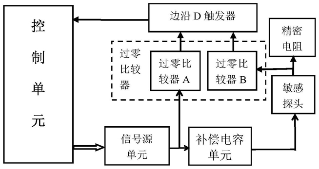 1.一种硬标签插磁数字量控制电路,其特征在于,包括:控制单元、信号源单元、补偿电容单元、敏感探头、精密电阻R1、过零比较器、边沿D触发器;所述信号源单元用于产生激励信号,所述激励信号的频率为插磁过程控制硬标签谐振频率的目标频率F0;所述补偿电容单元包括电容C1和微调电容C2,所述电容C1和微调电容C2并联连接,所述电容C1和微调电容C2并联后的第一端与所述信号源单元的输出信号端连接;所述敏感探头的第一端与所述电容C1和微调电容C2并联后的第二端连接;所述精密电阻R1的第一端与所述敏感探头的第二端连接,所述精密电阻R1的第二端与所述信号源单元的接地端连接;所述补偿电容单元的总电容C总和所述敏感探头等效感L1在所述目标频率F0对应角频率w0时,对应容抗和感抗大小相等,即满足w0L1=1/w0C总;所述过零比较器包括第一过零比较器A和第二过零比较器B,所述第一过零比较器A的输入端与所述信号源单元的输出信号端连接,所述第二过零比较器B的输入端与所述精密电阻R1的第一端连接;所述边沿D触发器的时钟脉冲CP输入端与所述第一过零比较器A的输出端连接,所述边沿D触发器的边沿D输入端与所述第二过零比较器B的输出端连接,所述边沿D触发器的第一信号输出端Q端与所述控制单元的I/O口电连接。2.根据权利要求1所述的一种硬标签插磁数字量控制电路,其特征在于:所述信号源单元采用可编程波形发生器AD9833,所述信号源单元工作在正弦波输出模式。3.根据权利要求1所述的一种硬标签插磁数字量控制电路,其特征在于:所述敏感探头是由铜丝绕制而成的多股线圈。4.根据权利要求1所述的一种硬标签插磁数字量控制电路,其特征在于:所述第一过零比较器A、第二过零比较器B采用型号为TLV3502的比较器。5.根据权利要求1所述的一种硬标签插磁数字量控制电路,其特征在于:所述边沿D触发器采用型号为SN74LVC1G79的边沿D触发器。6.根据权利要求1所述的一种硬标签插磁数字量控制电路,其特征在于:所述控制单元采用MSP430单片机。