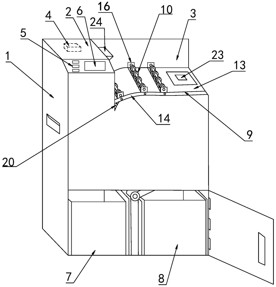 1.一种可将废纸中无墨部分分离的碎纸机,其特征在于:包括机箱、所述机箱顶部两侧对应设有控制部和入纸部;所述控制部内置有相互电连接的电源和控制器装置,所述控制部外侧设有分别与所述控制器装置电连接的控制按钮和显示屏;所述入纸部设置有分别与所述控制器装置电连接的过纸装置、吸纸装置、碎纸装置、光感装置和感光组件;所述过纸装置用于废纸的放入,所述吸纸装置安装在所述过纸装置上,所述碎纸装置和所述感光组件均设置在所述过纸装置的尽头,用于所述光感装置识别放在所述过纸装置上的废纸后通过所述控制器装置启动所述吸纸装置将所述废纸逐张传送至所述碎纸装置处,所述感光组件通过对传送至所述碎纸装置处的所述废纸的有墨部分和无墨部分的位置进行识别并将识别结果传送至控制器装置;所述控制器装置通过识别结果启动所述碎纸装置所述废纸的有墨部分和无墨部分依次进行切割;所述机箱底部位于所述碎纸装置的下方设有可将切割后的有墨碎纸和无墨碎纸进行分别收纳的分类回收箱。