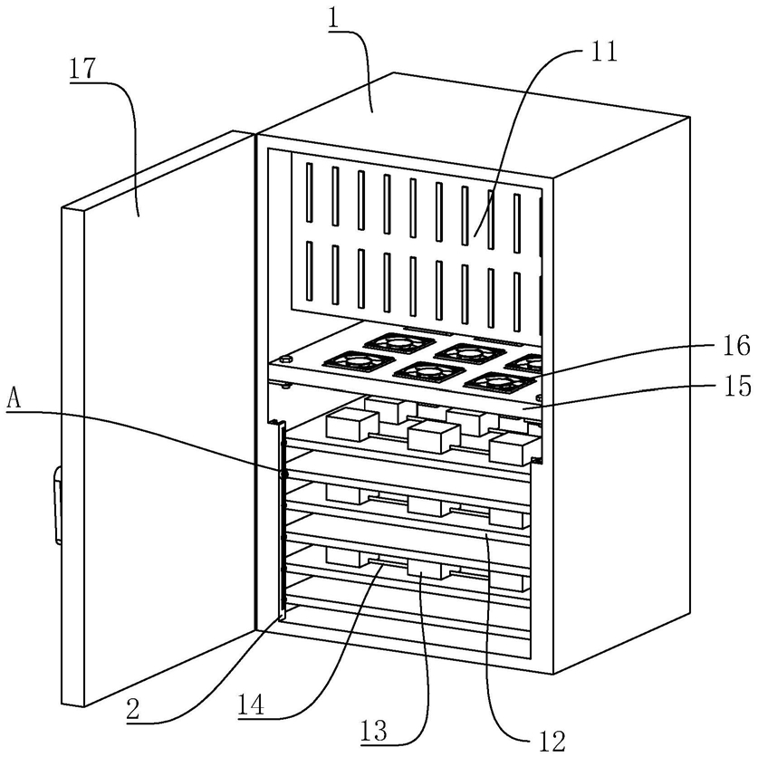 1.一种结构紧凑的测试机,包括箱体(1),其特征在于:所述箱体(1)内位于箱体(1)顶部设有电路模块(11),所述箱体(1)内还设有多个隔板(12),多个所述隔板(12)上方设有多个电源(13),多个所述电源(13)与电路模块(11)通过传输线(14)连接,所述多个隔板(12)顶部设有支撑板(15),所述支撑板(15)顶部设有散热风扇(16),所述箱体(1)内靠近箱门(17)一侧关于箱门(17)对称设有两个支撑架(2),所述箱体(1)内远离箱门(17)一侧对称设有两个固定架(3),所述隔板(12)安装在支撑架(2)上,所述隔板(12)与支撑架(2)之间设有调节组件(4)。