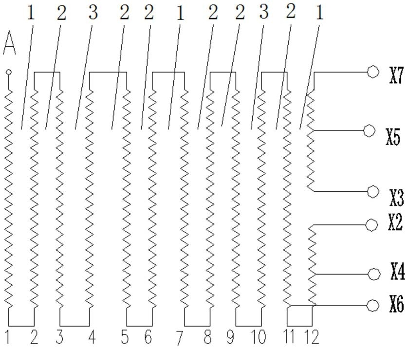 1.一种非晶合金变压器层间绝缘结构,该变压器的线圈层层绕制,其特征在于:在所述绕制线圈两端部和中部线圈层间放置全胶纸进行层间绝缘,其余线圈层间放置点胶纸进行层间绝缘。