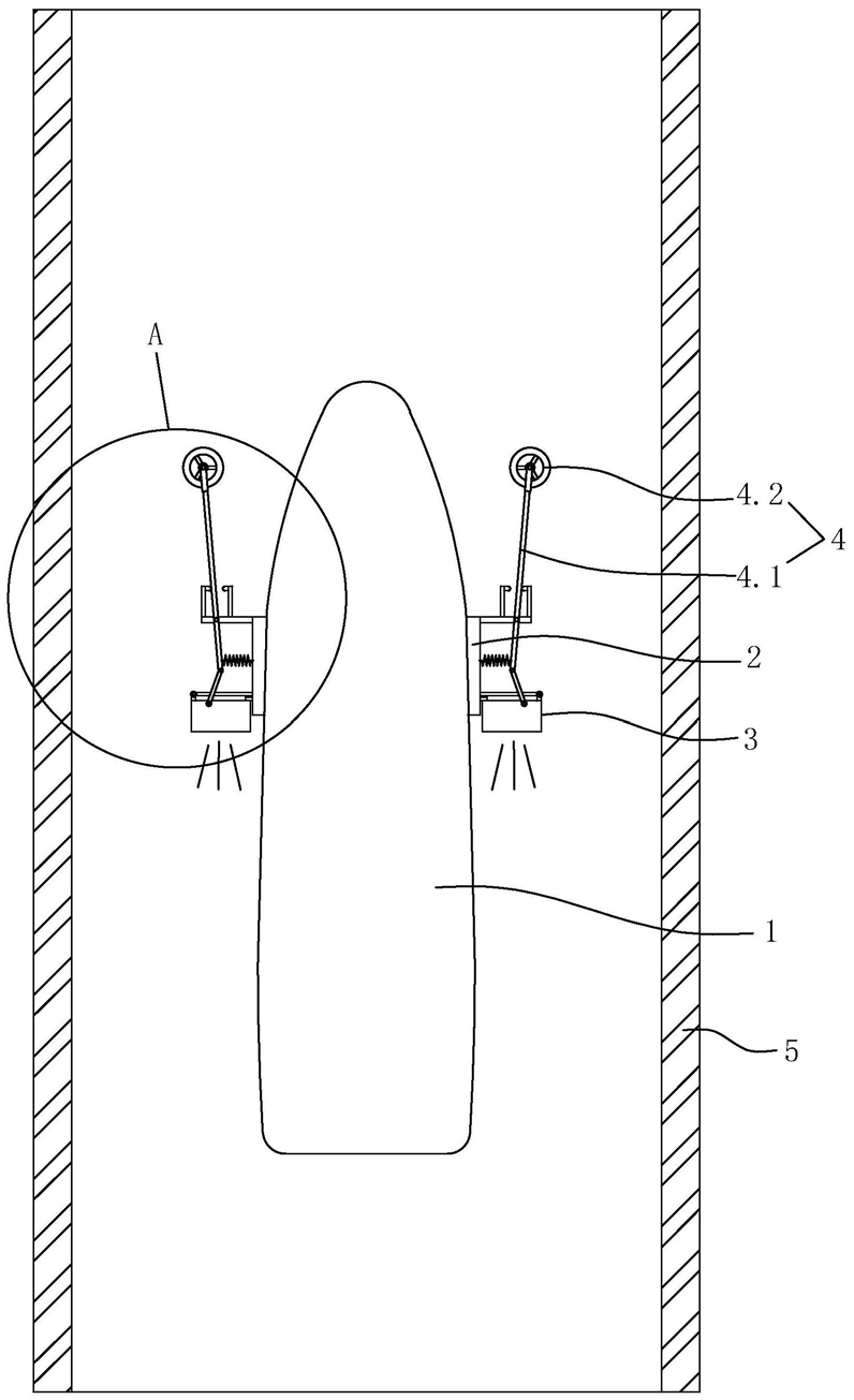 所述触发摆杆的第一端位于外罩与支架之间,所述连杆位于对应的安装座与竖向转轴之间,连杆的第一端与触发摆杆的第一端铰接相连,连杆的第二端与对应的外罩铰接相连,所述触发摆杆的第二端往船体的前端延伸并靠近船体的前端,所述触发滚轮通过第二轴杆转动设置在触发摆杆的第二端上,所述第二轴杆与竖向转轴相平行,所述内限位块、外限位块与触发滚轮位于第一轴杆的同一侧,所述触发摆杆位于内限位块与外限位块之间,且内限位块位于外限位块与船体之间,所述拉伸弹簧用于提供拉力,以使触发摆杆绕第一轴杆转动并抵在外限位块上,当触发摆杆抵在外限位块上时,所述导流通道沿船体的前后方向延伸;