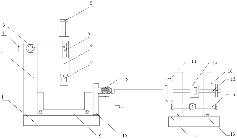 1.一种金属零部件外观检测工装,包括主板(1),其特征在于:所述主板(1)的左侧顶部固定焊接有固定支架(2)所述固定支架(2)的顶部表面固定安装有紧固螺丝(3),所述固定支架(2)的顶部镶嵌安装有托柱(4)所述托柱(4)的左侧拆卸安装有机箱(6),所述机箱(6)的顶部活动连接有按压手把(5)所述机箱(6)的中部固定安装有调节板(7),所述机箱(6)的顶部拆卸安装有挤压柱(8),所述主板(1)的中部拆卸安装有模具凹槽(9)所述主板(1)的顶部右侧固定安装有固定柱(10),所述固定柱(10)的右侧外壁固定连接有托板(11),所述托板(11)的顶部拆卸安装有驱动电机(12),所述驱动电机(12)右侧拆卸连接有转轴(13)所述转轴(13)的左侧拆卸安装有控速轮(14),所述转轴(13)的中部拆卸安装有卡接块(19),所述卡接块(19)的一侧设有活动支架(18),所述活动支架(18)的中部镶嵌安装有转轴(13),所述活动支架(18)的底部拆卸安装有活动块(16),所述活动块(16)的底部拆卸连接有副板(15),所述活动块(16)的顶部拆卸安装有伸缩支架(17)。