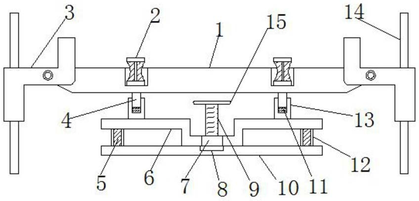 1.一种无砟轨道排架设备,包括排架(1)和托板(6),其特征在于:所述排架(1)左右两端部活动铰接有角度调整器(3),所述角度调整器(3)上竖直活动贯穿有竖向螺栓(14),所述排架(1)上部竖向搭接有竖向对称分布的轨道(2),所述排架(1)底部垂直焊接有定位杆(4),所述托板(6)顶部左右两侧均垂直固定焊接有限位筒(13),所述限位筒(13)与所述定位杆(4)活动插接,所述托板(6)中部竖直开设有螺纹孔(7),所述螺纹孔(7)内竖直向下螺纹贯穿有螺纹丝杆(9),所述螺纹丝杆(9)下端与固定嵌入在底板(10)顶部的轴承(8)的中轴固定插接,且轴承(8)位于所述底板(10)上部中间位置,所述底板(10)顶部左右两侧均垂直焊接有套筒(12)。