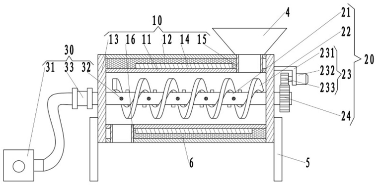 1.一种用于刨花板原料的烘干装置,其特征在于,包括:加热圆筒组件、螺旋传输组件和热气烘干组件;所述螺旋传输组件位于加热圆筒组件内且与其转动连接,适于将加热圆筒组件内的刨花板原料从一端螺旋移动到另一端;所述热气烘干组件与螺旋传输组件连接,适于将螺旋移动的刨花板原料烘干;所述加热圆筒组件包括内圆管、两块圆封板和套装在内圆管外侧的外圆管,所述内圆管和外圆管的两端分别密封连接有所述的圆封板,所述内圆管的外圆包裹有弧形电加热板。2.根据权利要求1所述的用于刨花板原料的烘干装置,其特征在于,所述螺旋传输组件包括空心轴、套装在空心轴上的螺旋叶片和驱动空心轴转动的驱动件,所述空心轴的一端密封且外圆套装有从动齿轮。3.根据权利要求2所述的用于刨花板原料的烘干装置,其特征在于,所述驱动件包括L形安装板、安装在L形安装板上的电机和套装在电机输出轴上的主动齿轮,所述L形安装板与所述的圆封板固定连接,所述主动齿轮与所述的从动齿轮啮合连接。4.根据权利要求2所述的用于刨花板原料的烘干装置,其特征在于,所述热气烘干组件包括电加热风机、若干喷气嘴和连接在空心轴另一端的转动接头,所述喷气嘴间隔设置且与空心轴连接,所述电加热风机和转动接头之间通过管道连接。5.根据权利要求1所述的用于刨花板原料的烘干装置,其特征在于,所述加热圆筒组件还包括进料圆管和出料圆管,所述进料圆管穿设在加热圆筒组件的右上端,所述出料圆管穿设在加热圆筒组件的左下端,所述进料圆管的上端固定连接有圆锥进料斗。6.根据权利要求1所述的用于刨花板原料的烘干装置,其特征在于,所述加热圆筒组件的两端分别固定连接有V型支撑板。