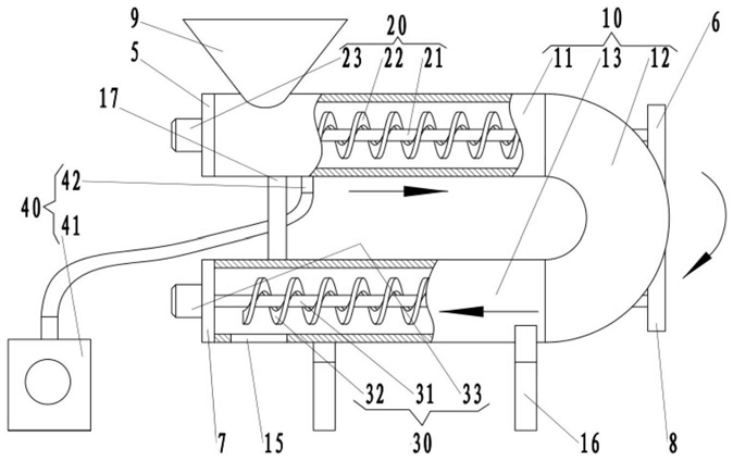 1.一种用于刨花板原料的烘干装置,其特征在于,包括:U型管道,所述U型管道包括依次连接的上圆管、弧形圆管和下圆管;