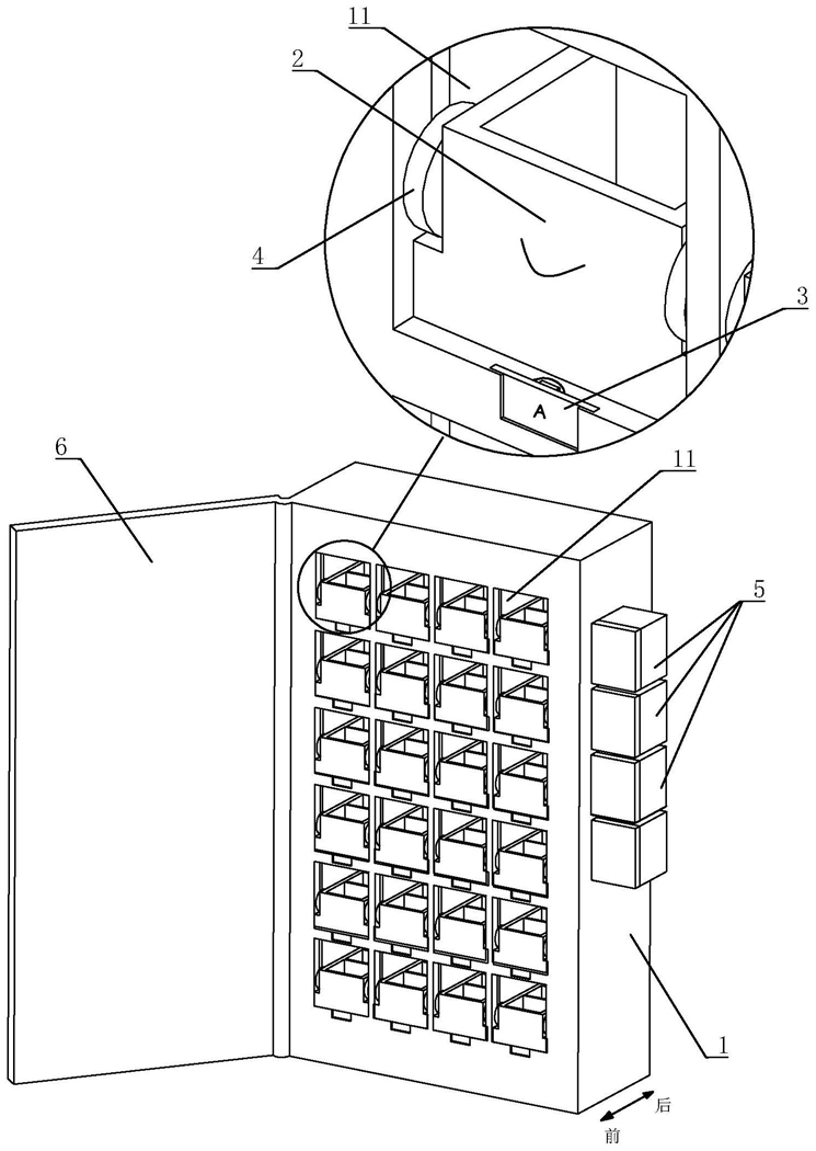 所述柜体(1)前侧面排列设置有多个容纳仓(11);