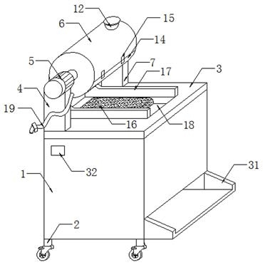 6.根据权利要求1所述的一种除尘杀菌式荔枝干燥装置,其特征在于:所述箱体(1)的正面固定安装有开关面板(32),所述开关面板(32)的表面分别安装有电机开关、传送带开关、紫外线照射灯开关、第一电动伸缩柱开关、第二电动伸缩柱开关和热吹风机开关,所述电机(5)、传送带(16)、紫外线照射灯(21)、第一电动伸缩柱(22)、第二电动伸缩柱(26)和热吹风机(25)分别通过电机开关、传送带开关、紫外线照射灯开关、第一电动伸缩柱开关、第二电动伸缩柱开关和热吹风机开关与电源电性连接。