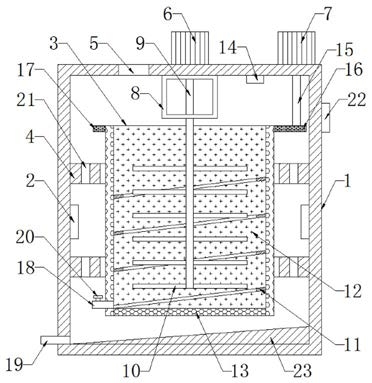 1.一种荔枝龙眼旋转式干燥炉,包括炉体(1),其特征在于,所述炉体(1)内壁两侧的中部分别固定设有两个电热板(2),所述炉体(1)的内部设有筒体(3),所述炉体(1)内壁的顶部和底部分别固定设有两个环形固定块(4),两个所述环形固定块(4)的内壁均通过回转支承分别与筒体(3)外侧的顶部和底部转动连接,所述炉体(1)顶端的一侧开设有加料口(5),所述炉体(1)顶端的中部和另一侧分别固定安装有运转方向相同的第一电机(6)和第二电机(7),所述炉体(1)内壁顶端的中部固定设有矩形框(8),所述矩形框(8)的底端与第一转轴(9)的顶部转动穿插连接,所述第一转轴(9)的顶端与第一电机(6)的输出轴固定连接,所述第一转轴(9)置于筒体(3)的内部,所述第一转轴(9)两侧的底部固定设有若干个搅拌叶(10),所述炉体(1)的内部转动安装有第二转轴(15),所述第二转轴(15)的顶端与第二电机(7)的输出轴固定连接,所述第二转轴(15)的底端固定设有第一齿轮(16),所述筒体(3)外侧的顶端固定设有第二齿轮(17),所述第二齿轮(17)与第一齿轮(16)啮合,所述筒体(3)的内壁固定设有螺旋状的倒料板(11)。