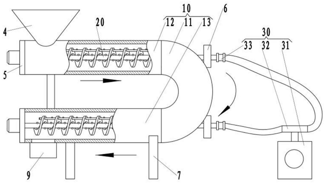 1.一种刨花板原料的搅拌烘干装置,包括:U形筒,所述U形筒包括弧形管、连接在弧形管两端的上圆管和下圆管,其特征在于,还包括两个螺旋搅拌出风组件和与螺旋搅拌出风组件连接的热风供给组件;所述上圆管和下圆管内均设置有所述的螺旋搅拌出风组件,适于将U形筒内的刨花板原料搅拌烘干;所述螺旋搅拌出风组件包括空心轴、L形管和套装在空心轴上的螺旋叶片,所述L形管水平穿设在螺旋叶片上,且一端与空心轴的内孔连通,另一端连接有圆封板,所述空心轴上间隔连接有若干第一喷气嘴,所述L形管上连接有若干第二喷气嘴,所述空心轴的一端连接有电机。2.根据权利要求1所述的刨花板原料的搅拌烘干装置,其特征在于,所述热风供给组件包括电加热风机、三通接头和两个转动接头,所述三通接头与电加热风机的出风口连接,所述转动接头与空心轴远离电机的一端连接,所述三通接头与转动接头之间通过管道连接。3.根据权利要求1所述的刨花板原料的搅拌烘干装置,其特征在于,所述上圆管的左上端连接有锥形下料斗。4.根据权利要求1所述的刨花板原料的搅拌烘干装置,其特征在于,所述上圆管和下圆管远离弧形管的一端均固定连接有圆形轴承座,所述弧形管上间隔固定连接有两个方形轴承座,所述圆形轴承座和方形轴承座之间转动连接有所述的空心轴。5.根据权利要求1所述的刨花板原料的搅拌烘干装置,其特征在于,所述下圆管的下端间隔连接有两块支撑板,所述支撑板的顶端设置有弧形槽。6.根据权利要求1所述的刨花板原料的搅拌烘干装置,其特征在于,所述下圆管的下端靠近圆形轴承座的一端连接有出料管。