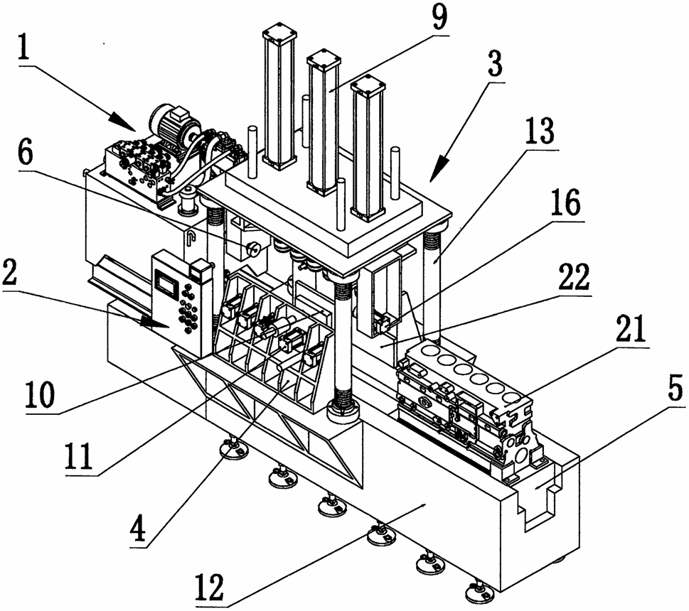 1.柴油发动机机体干式自动检漏机,包括底座(12)、支架(13),其特征在于:在所述底座(12)上装有滑块(5),该滑块(5)与横移控制机构(1)相连,在所述支架(13)上装有升降动力源(9),该升降动力源(9)下通过纵向移动板(14)装有气缸孔锁紧块(15),该气缸孔锁紧块(15)与锁紧动力源(7)相连;在所述纵向移动板(14)的两侧装有水道侧向闷块(6),该水道侧向闷块(6)与侧向闷块动力源(16)相连,在所述底座(12)上、并在滑块(5)的侧边处装有侧架(4),该侧架(4)上装有若干个水道正向闷块(17),所述水道正向闷块(17)与正向闷块动力源(11)相连,且在其中一个水道正向闷块中装有气管(18)。