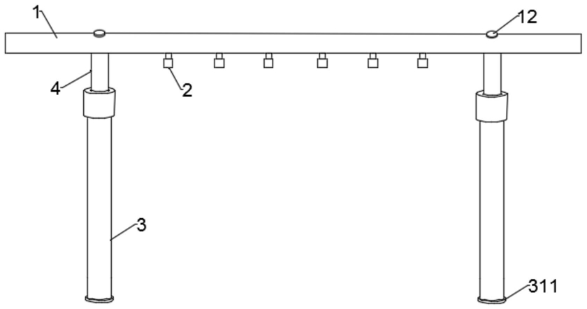 1.一种视觉艺术展示用灯光调节架,其特征在于,包括两个竖直设置的可伸缩支撑杆,两个所述支撑杆的顶端之间可拆卸连接有横杆(1),所述横杆(1)上设有若干投光灯(2);