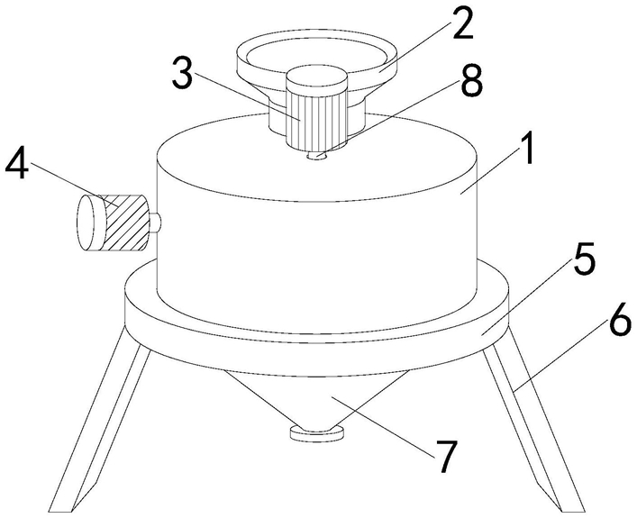 其特征在于:料仓碾压结构包括料仓(1)、原料口(2)、第一电机(3)、旋转中轴(8)、碾压盘(9)、辊轴(10)和过筛网(11),原料口(2)开设于料仓(1)顶部一侧的边缘处,第一电机(3)贯通安装于料仓(1)的顶部中心处,旋转中轴(8)销接连接于第一电机(3)的中轴处,碾压盘(9)固定于旋转中轴(8),辊轴(10)套装于旋转中轴(8),过筛网(11)安装于碾压盘(9)的内部;