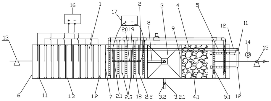 1.一种组合式高浓度含铜废水处理装置,其特征在于,包括依次连接的电沉积池(1)、电絮凝池(2)、沉淀池(3)、吸附池(4)和膜池(5),所述电沉积池(1)内设有若干电沉积阳极板(1.1)和电沉积阴极板(1.2),所述电絮凝池(2)内沿水流方向依次设有电絮凝阳极板(2.1)、感应极板组(2.3)和电絮凝阴极板(2.2),所述沉淀池(3)内设有斜管(3.1)和排泥管(3.2),所述吸附池(4)内设有吸附材料(4.1),所述膜池(5)内设有膜组件(5.1)。