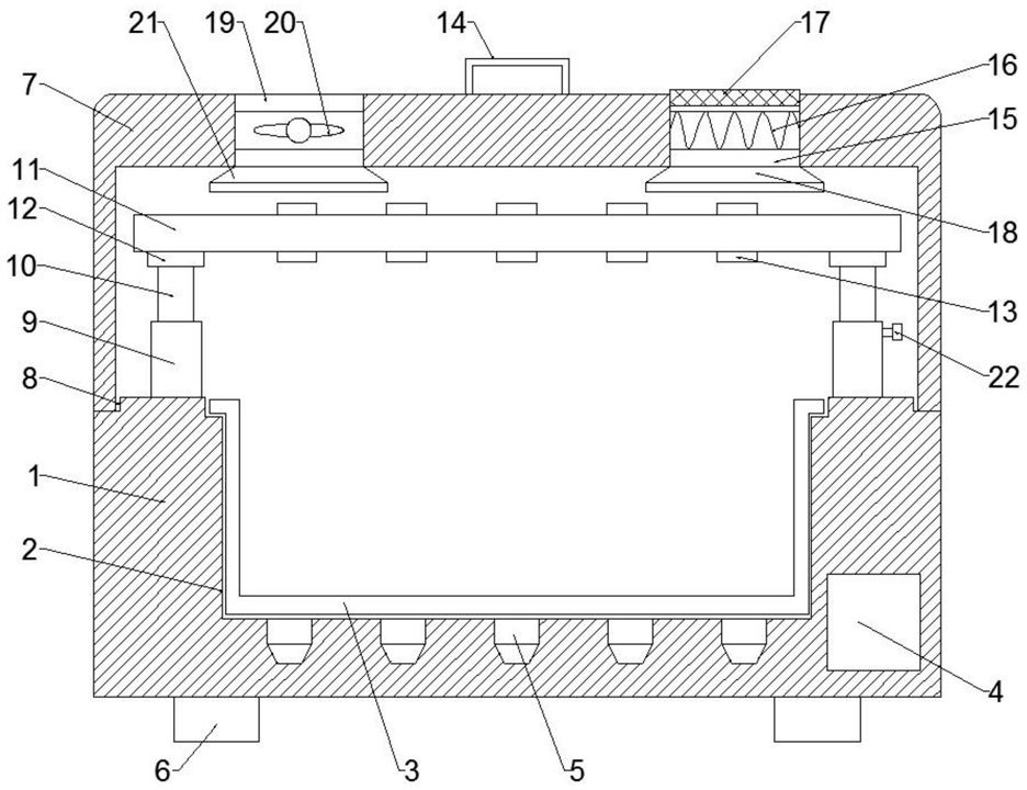 1.一种化妆刷清洗装置,包括箱体(1)、安装槽(2)和内胆(3),其特征在于,所述箱体(1)内部设有安装槽(2),安装槽(2)内设有内胆(3),箱体(1)右侧底部设有超声波发射器(4),安装槽(2)底部设有超声波换能器(5),所述箱体(1)底端四角处对称设有支撑脚(6),箱体(1)上端对称安装有套管(9),套管(9)插装活动柱(10),且活动柱(10)滑动连接套管(9)内壁,活动柱(10)上端固定连接有横梁(11),横梁(11)上安装有若干橡胶套(13),箱体(1)上端设有箱盖(7),箱盖(7)上端中部设有拉手(14),箱盖(7)右端开设有进气口(15),进气口(15)内部安装有电加热丝(16),且进气口(15)下端安装有进气罩(18),箱盖(7)左端开设有出气口(19),出气口(19)内部安装有排风扇(20),且出气口(19)下端安装有出气罩(21)。