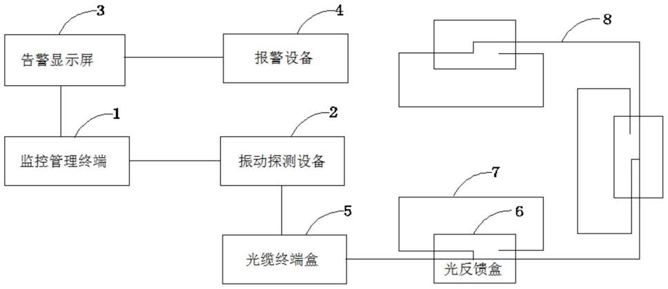 1.一种入侵报警系统,其特征在于:包括中控系统和探测防区,所述中控系统与所述探测防区相连,所述中控系统设置于中控室内,包括监控管理终端、告警显示屏、报警设备和振动探测设备,所述监控管理终端分别与所述告警显示屏、所述振动探测设备相连,所述告警显示屏联动报警设备;所述探测防区由光反馈盒、传输光缆和传感光缆组成,所述传输光缆通过所述光反馈盒转换传感光缆光信号分配、光器件熔接保护。
