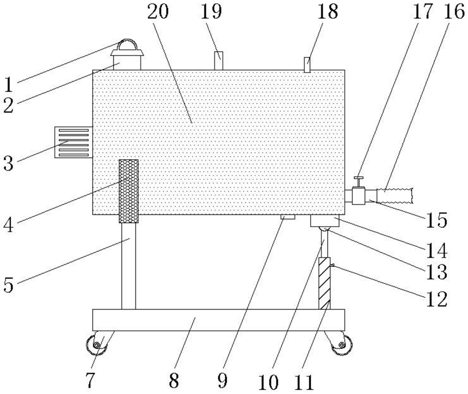 所述混料箱(20)的左侧面固定连接有搅拌电机(3),所述混料箱(20)的左侧面固定镶嵌有第一密封轴承(32),所述搅拌电机(3)的输出端固定连接有转动轴(30),所述转动轴(30)的右端贯穿第一密封轴承(32)并延伸至混料箱(20)的内部,所述转动轴(30)的外表面固定连接有搅拌杆(31),所述混料箱(20)的内侧壁固定连接有与混料箱(20)相适配的不锈钢过滤网(27),且不锈钢过滤网(27)位于转动轴(30)的右侧,所述混料箱(20)的底面开设有排渣口(29),且排渣口(29)位于不锈钢过滤网(27)的左侧,所述排渣口(29)的内部放置有与排渣口(29)相适配的密封塞(9),所述混料箱(20)的内壁固定连接有与混料箱(20)相适配的活性炭过滤网(28),且活性炭过滤网(28)位于不锈钢过滤网(27)的右侧,所述不锈钢过滤网(27)的右侧面固定连接有无纺布过滤网(26),所述混料箱(20)右侧面的下部固定连通有出料管(15),所述出料管(15)的外表面固定安装有阀门(17),所述出料管(15)的右端固定连通有软管(16)。