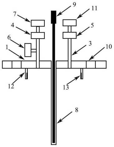 1.一种可计算流体消耗量的恒压反应装置,包括反应装置盖(1)、设置于反应装置盖(1)下端的反应装置腔体(14)和电路控制器,其特征在于:还包括从反应装置盖(1)上端贯穿至反应装置腔体底部的测温导管(8),所述测温导管(8)内设有热电偶(9),所述热电偶(9)的电控部件与电路控制机构电性连接;所述反应装置盖(1)的出口端通过管道依次设有出料阀(5)和第一质量流量计(7),所述反应装置盖(1)的进口端通过管道依次设有进料阀(4)和第二质量流量计(11);所述进料阀(4)和出料阀(5)的电控部件均与电路控制机构电性连接,电路控制机构分别将启闭控制信号输出至进料阀(4)和出料阀(5);所述反应装置盖(1)通过管道还设有压力传感器(6);所述的第一质量流量计(7)、第二质量流量计(11)和压力传感器(6)的电控部件均与电路控制机构电性连接。