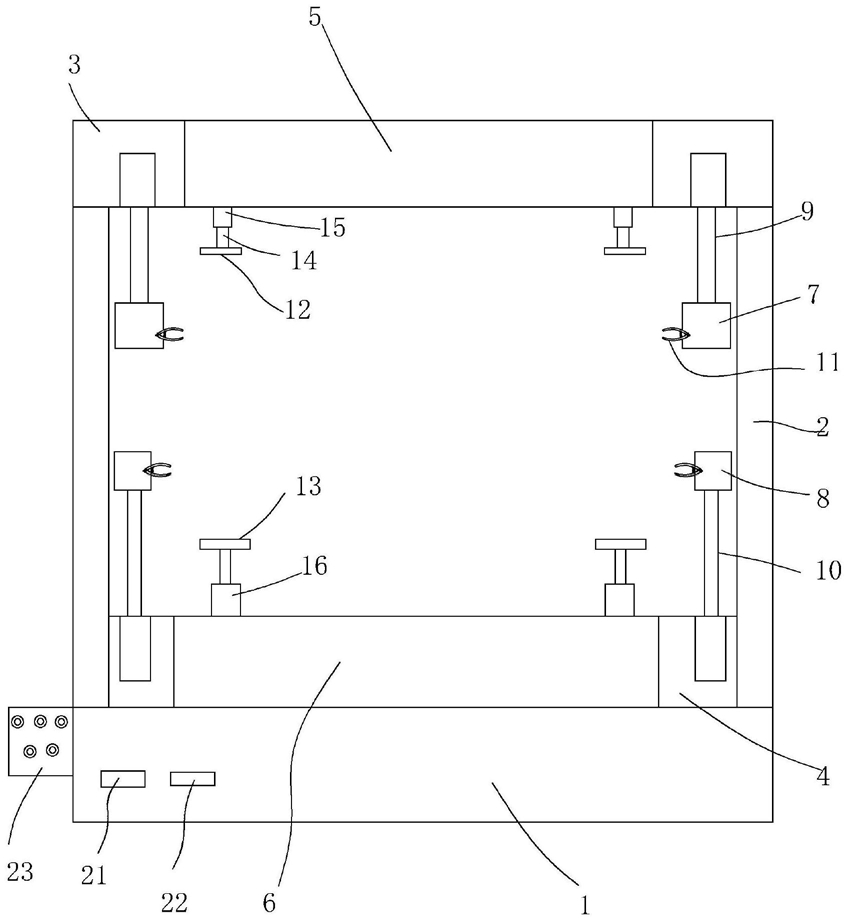 4.根据权利要求3所述的瓦楞纸板打包机构,其特征在于:在所述底座上固定有电源插头、外接气泵连接端子和开关面板,在所述开关面板上固定有旋转电机控制开关、转动控制电机启停按钮、调节气缸控制按钮、举升气缸控制开关和升降气缸控制按钮。