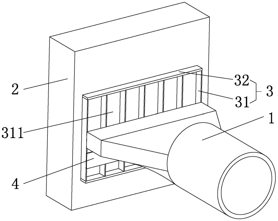 7.根据权利要求4所述的一种玻璃熔窑池壁绑砖保护结构,其特征在于,所述疏风装置(3)还包括斜挡板(34),所述斜挡板(34)位于每个导风槽(311)内且呈倾斜设置,所述斜挡板(34)的一端抵接在冷却风嘴(1)的出气端上侧,所述斜挡板(34)的另一端设置在导风槽(311)上端的玻璃熔窑池外壁(2)上。
