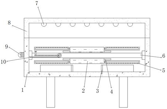 5.根据权利要求4所述的一种毛巾折叠装置,其特征在于,所述底座(1)的顶部设有门型架(8),且门型架(8)的顶部内壁设有均匀分布的紫外线灯(7)。