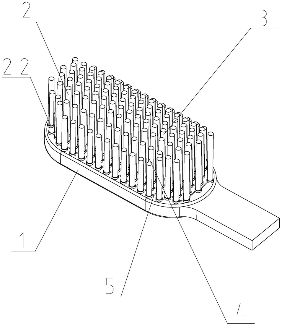 6.根据权利要求5所述的一种牙刷头,其特征在于:所述刷毛(2)的外侧设有连接环(2.2),所述连接环(2.2)包覆细刷毛(2.1),所述连接毛(5)的两端分别固定连接在不同刷毛(2)的连接环(2.2)上。