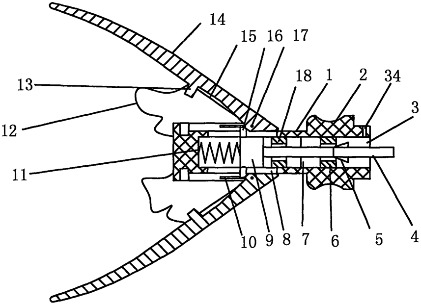 所述的飞爪(14)一端带有转轴(17),转轴(17)两侧向外伸出嵌入到滑槽(10)内,并可以在滑槽(10)内滑动,飞爪(14)的中部内侧制有凸起(13),当飞爪(14)处于收拢状态时,凸起(13)卡在中心体(1)的左面圆周上的凹槽内;所述的中心体(1)的内部为左端封闭的圆柱形空心体(3),在空心体(3)左端安装小弹簧(11),小弹簧(11)的右端抵在圆柱体(9)上;在圆柱形空心体(3)的中部嵌入定位体(18)并固定,在靠近中心体(1)的尾部处嵌入卡柱(6)并固定,卡柱(6)的左端设有保险插孔(7),推杆(4)穿过卡柱(6)及定位体(18)的中心孔后,与圆柱体(9)相连接;