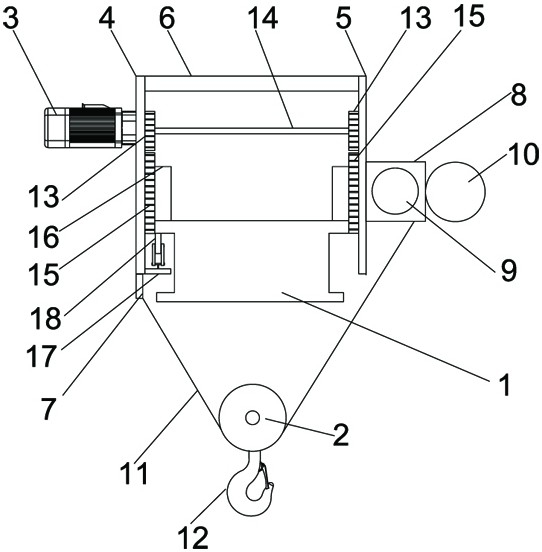 1.一种低净空钢丝绳电动葫芦,包括主梁、葫芦本体,其特征在于:主梁上表面上装有能够沿主梁上表面往复运动的运行车体,运行车体包括行走电机、行走侧板和起升侧板,行走侧板和起升侧板平行且间隔设置,行走侧板和起升侧板之间固定连接有支撑柱,行走电机固定连接在行走侧板的外壁,行走侧板的底部固定连接有定滑轮,起升侧板的外壁与葫芦本体固定连接,葫芦本体包括外壳,外壳内部设有卷筒,外壳的侧壁上固定连接有起升电机,起升电机与卷筒通过传动齿轮传动连接,卷筒内部绕设有钢丝绳,钢丝绳的一端固定连接在定滑轮上,定滑轮与卷筒之间的钢丝绳上套设有动滑轮,动滑轮的下方安装有吊钩装置。