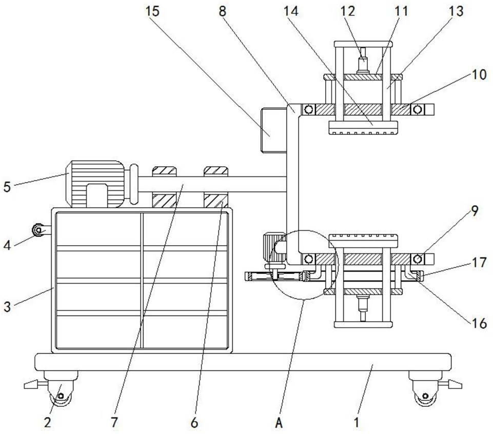1.一种航空设备维修用辅助设备,包括基板(1),其特征在于:所述基板(1)的底部固定安装有万向轮(2),所述基板(1)的顶部固定安装有存储柜(3),所述存储柜(3)的左侧固定安装有推杆(4),所述存储柜(3)的顶部固定安装有第一伺服电机(5),所述存储柜(3)的顶部且位于第一伺服电机(5)的右侧固定安装有轴承座(6),所述第一伺服电机(5)的输出轴上套接有贯穿并延伸至轴承座(6)右侧的转轴(7),所述转轴(7)的右侧固定安装有旋转架(8),所述旋转架(8)的顶部和底部均固定安装有转盘(9),所述转盘(9)的内壁固定安装有安装板(10),所述安装板(10)的相背侧均固定安装有第一导向架(11),所述第一导向架(11)的相背侧均固定安装有电动推杆(12),所述电动推杆(12)的相背侧均固定安装有贯穿并延伸至安装板(10)相对侧的第二导向架(13),所述第二导向架(13)的相对侧均固定安装有夹板(14),所述旋转架(8)的左侧且位于转轴(7)的上方固定安装有配重块(15),所述安装板(10)底部且位于旋转架(8)的下方固定安装有支架(16),所述支架(16)的外壁套接有齿轮盘(17),所述旋转架(8)的左侧且位于转轴(7)的下方固定安装有第二伺服电机(18),所述第二伺服电机(18)的输出轴上套接有与齿轮盘(17)相啮合的传动齿轮(19)。