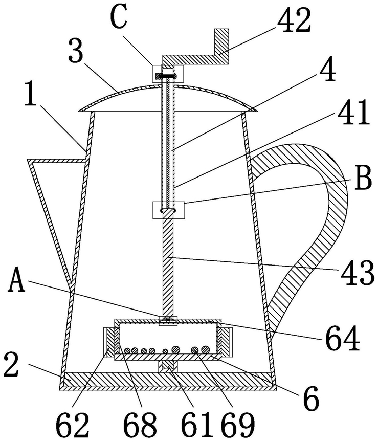 4.根据权利要求1所述的一种过滤式咖啡壶,其特征在于:所述过滤盒(6)下端为实心结构,所述过滤盒(6)外侧壁均匀设有与所述弧形扇叶(62)旋向相反的条状贯通孔(63),所述盒盖(64)上均匀设有镂空孔(67),且所述过滤盒(6)内侧壁和所述盒盖(64)下端面均安装有过滤网(68)。