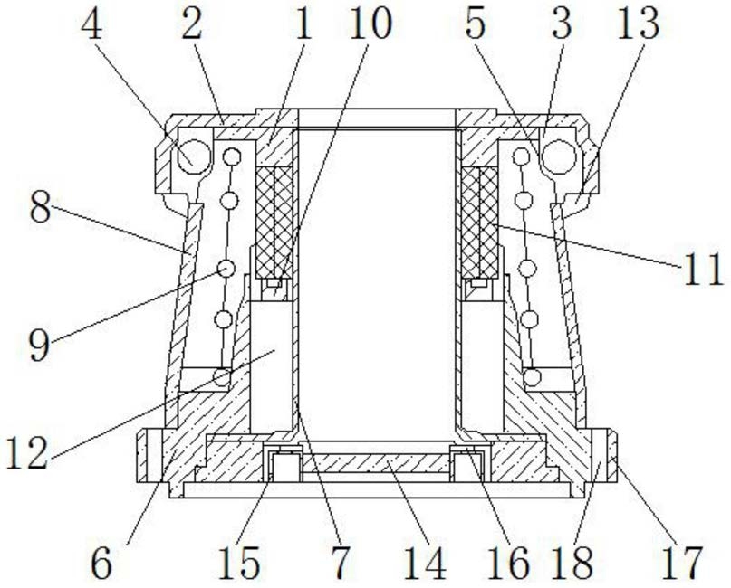 1.推式自调心液分离轴承分单元,包括套筒(1),其特征在于:所述套筒(1)的顶部套设有外圈(2),所述外圈(2)的内腔固定连接有内圈(3),所述外圈(2)与内圈(3)之间活动连接有钢球(4),所述内圈(3)与外圈(2)之间设置有保持架(5),所述钢球(4)通过保持架(5)均匀分布在内圈(3)与外圈(2)之间,所述套筒(1)的底部固定连接有缸体(6),所述缸体(6)的内腔固定连接有轴芯(7),所述轴芯(7)的顶部与套筒(1)的底部通过钢丝卡圈连接,所述内圈(3)的底部固定连接有内防尘罩(8),所述内防尘罩(8)的内腔固定连接有复位弹簧(9),所述复位弹簧(9)的底部通过弹簧座与缸体(6)固定连接,所述轴芯(7)的两侧均固定连接有凹形皮圈(10),所述凹形皮圈(10)的顶部固定连接有皮圈座(11),所述缸体(6)与轴芯(7)之间开设有液压腔(12)。
