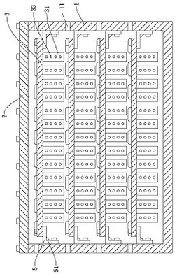 1.一种锂电池组的安装结构,包括上端开口且内部设置有空腔的电池箱(1),所述电池箱(1)的开口端固定有盖板(2),其特征在于:所述电池箱(1)的内部设置有若干个由上至下分布的电池架(3),每个电池架(3)均与电池箱(1)的内壁固定,相邻两个电池架(3)之间留有间隙,每个电池架(3)的下端面上均设置有若干个呈阵列状分布的凸台(31),位于每个凸台(31)所在位置处均形成上端开口的电池仓(32),每个凸台(31)的侧壁上均设置有若干个与电池仓(32)连通的通孔(33),每个电池仓(32)的内部均嵌装有锂电池(4),每个锂电池(4)的外周壁均与对应的电池仓(32)的内壁贴紧,位于每个电池架(3)所在位置处的电池箱(1)的侧壁上均设置有若干个呈周向分布的散热孔(11)。