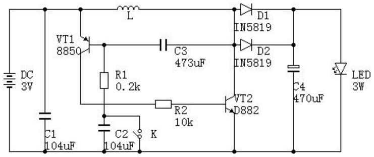 10H、第一二极管和第二二极管的型号均为IN5819、发光二极管为3W;电池的正极同时与第一电容的第一端、第一三极管的发射极和电感的第一端连接,电池的负极同时与第一电容的第二端、第二电容的第一端、开关的第一端、第二三极管的发射极、第四电容的第一端和发光二极管的负极连接,第一三极管的集电极与第二电阻的第一端连接,第一三极管的基极同时与第一电阻的第一端和第三电容的第一端连接,第一电阻的第二端同时与第二电容的第二端和开关的第二端连接,第二电阻的第二端与第二三极管的基极连接,第二三极管的集电极同时与电感的第二端、第一二极管的正极、第三电容的第二端和第二二极管的正极连接,第一二极管的负极同时与第二二极管的负极、第四电容的第二端和发光二极管的正极连接。