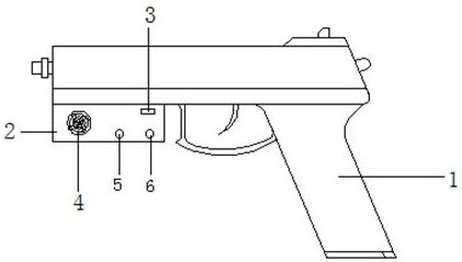 1.一种带有风力检测的枪械,包括枪体(1)和检测盒(2),其特征在于:所述枪体(1)前端下部设置有检测盒(2),所述检测盒(2)两端设置有开关(3)、风轮(4)、风速摁键(5)、温度摁键(6)和充电端口(7),所述检测盒(2)内部设置有MUC微处理器(8),所述MUC微处理器(8)线性连接设置有电源模块(9)、开关模块(10)、风速传感器(11)、风速检测模块(12)、数据存储模块(13)、温度传感器(14)、温度检测模块(15)、语音播报模块(16)和无线通信模块(17),所述检测盒(2)通过无线通信模块(17)连接外部接收设备(18)。