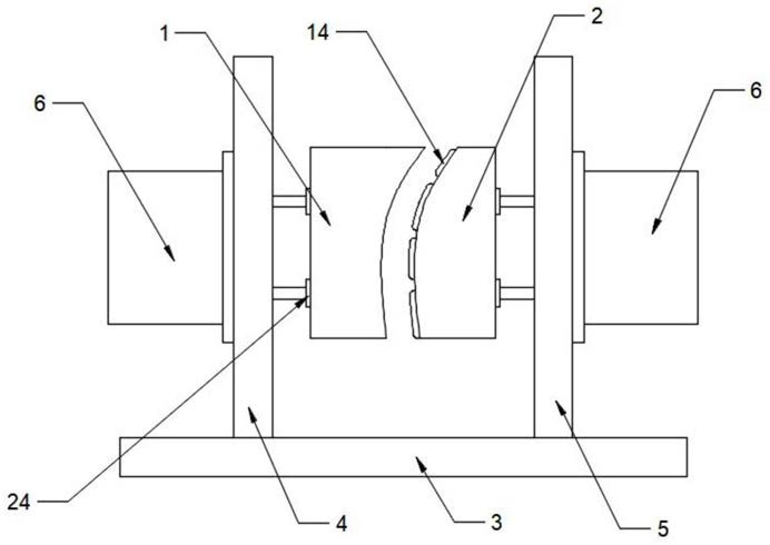1.酒店用手推式洗地机模具,包括左模和右模,所述左模和右模相互匹配结合,结合后型腔为洗地机外壳状;其特征在于,还包括驱动机构和机架,所述机架包括底板、左侧板和右侧板;所述左侧板竖直安装在底板的左端,所述右侧板竖直安装在底板的右端;所述驱动机构包括两个双轴气缸,所述两个双轴气缸分别安装在左侧板的左侧面和右侧板的右侧面,并且两个双轴气缸的活塞端分别垂直朝向左侧板和右侧板之间;所述左模底部设有弹性伸缩件,所述左模通过弹性伸缩件安装在位于左侧板双轴气缸的活塞端上,所述右模底部也设有弹性伸缩件,所述右模通过弹性伸缩件安装在位于右侧板双轴气缸的活塞端上,并且左模和右模的型腔面相互对应。
