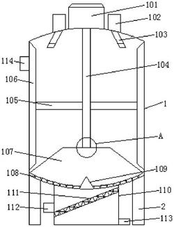 所述反应釜(1)包括电机(101)、注水口(102)、喷头(103)、转轴(104)、连接杆(105)、刮板(106)、叶片(107)、锯齿(108)、凹槽(109)、收集箱(110)、过滤板(111)、排污口(112)、排水口(113)、控制开关(114)、密封门(115),所述反应釜(1)的顶部固定安装有电机(101),所述电机(101)的一侧固定安装有注水口(102),所述注水口(102)的底端固定安装有喷头(103),所述喷头(103)的一侧活动连接有转轴(104),所述转轴(104)的一侧固定安装有连接杆(105),所述连接杆(105)的一端固定安装有刮板(106),所述转轴(104)的底端固定安装有叶片(107),所述叶片(107)的底端固定安装有锯齿(108),所述锯齿(108)的一侧嵌入设置有凹槽(109),所述反应釜(1)的下方固定安装有收集箱(110),所述收集箱(110)的内部固定安装有过滤板(111),所述过滤板(111)的一端固定安装有排污口(112),所述收集箱(110)的外壁底端固定安装有排水口(113),所述反应釜(1)的外壁一侧固定安装有控制开关(114),所述反应釜(1)的正面活动连接有密封门(115)。