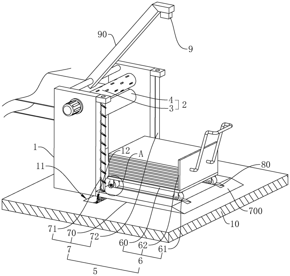 4.根据权利要求1所述的翻折机送纸结构,其特征在于,所述升降部(7)还包括丝杠(71)和支撑杆(72),丝杠(71)和支撑杆(72)均竖直设置,丝杠(71)与支撑杆(72)垂直贯穿升降板(70),丝杠(71)与升降板(70)螺纹连接,所述支撑杆(72)与升降板(70)滑动连接,所述支撑杆(72)和丝杠(71)的顶端均与机架(1)转动连接,支撑杆(72)的底部与地面(10)转动连接,所述地面(10)上开设有安装槽(11),安装槽(11)内设置有用于驱动丝杠(71)转动的驱动件(12)。