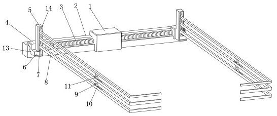 3.根据权利要求1所述的一种用于道路运输用货车货物防坠落结构,其特征在于:所述滑块(4)的内部设置有与第一丝杆(3)相配合的螺纹,且滑块(4)与横梁(2)通过卡槽(13)进行固定限位。